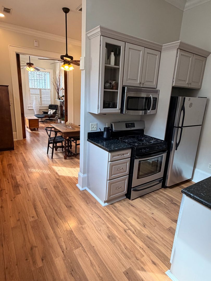This gorgeous uptown home features hardwood floors throughout, central air conditioning and heat, washer and dryer in unit, one and a half baths, and a shared, fenced in backyard. This unit has loads of charm with a cute front porch, built in shelving, a spacious bedroom, and tons of natural light. Schedule a viewing today, this one won't last long.