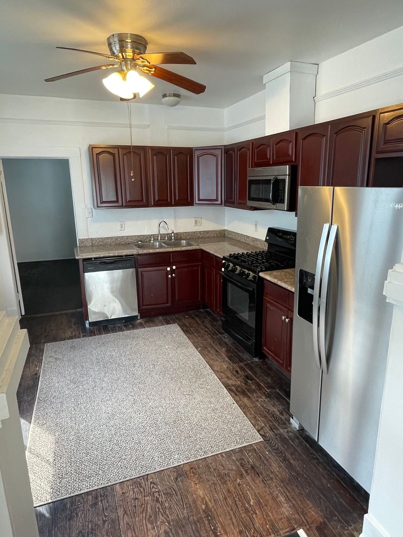 This 2BD/1BA unit features a large front porch, hardwood floors throughout, washer and dryer in unit, and a large backyard. There is an also a spacious sunroom looking out to the backyard. Tenants pay all utilities.